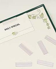 1-3/4" clear plastic clips have an adhesive back. Just peel and stick. Great for daily specials! 200 per bag. Just peel and stick. Great for daily specials! 200 per bag.